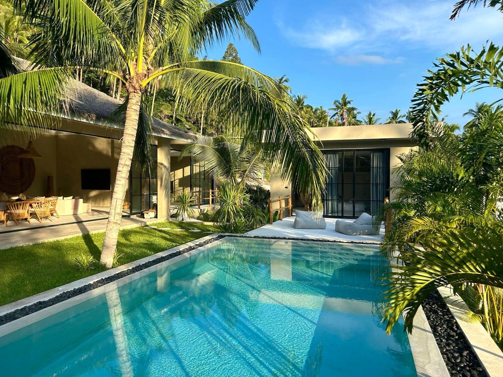 L’agence M.I.S.S. (My Immo Services Samui) vous présente la Villa Palmera, un véritable havre de paix niché dans une nature luxuriante. Cette propriété d’exception allie architecture contemporaine et sérénité tropicale, offrant des volumes rares sur le marché de Lamai.
