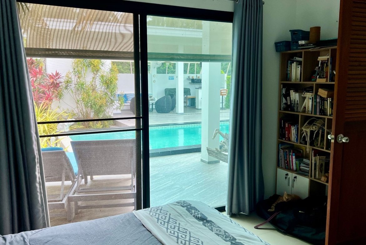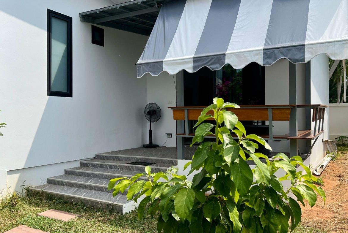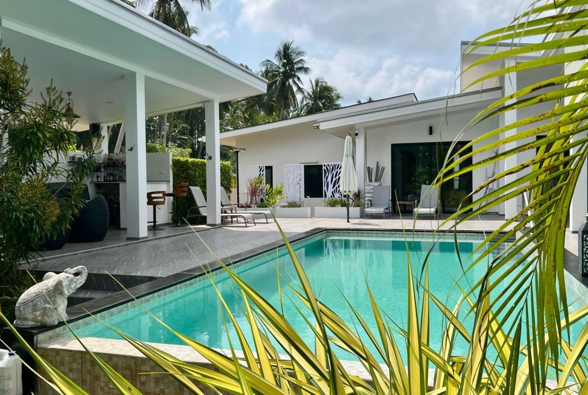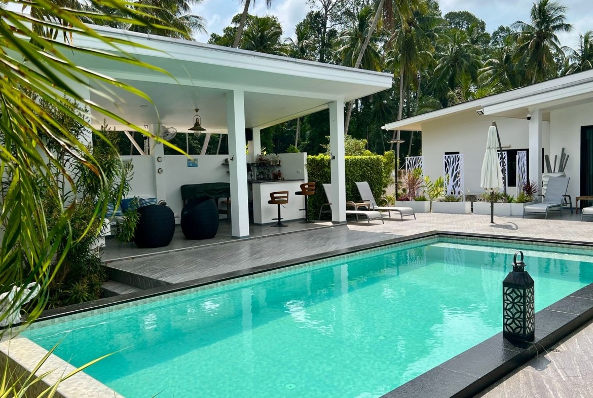La propriété comprend une habitation principale de 3 chambres et une dépendance autonome de 40 m² (chambre, salon, cuisine, SDB). Cette flexibilité est parfaite pour recevoir la famille, les amis, ou pour un usage professionnel. Sans charges de copropriété, avec son propre puits et un titre Chanote, cette villa vendue avec sa compagnie est une opportunité clé en main pour une installation sereine à Koh Samui.